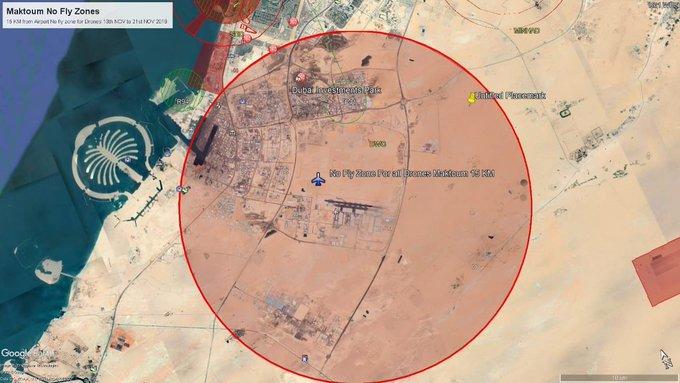 Dubai Civil Aviation Authority has announced a 15km drones exclusion zone around Al Maktoum International Airport for the duration of the Dubai Airshow .