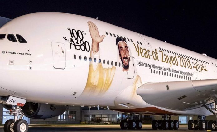 Emirates celebrated the milestone delivery of its 100th Airbus A380 aircraft on Friday with a monumental tribute to His Highness Sheikh Zayed bin Sultan Al Nahyan, the first President of the UAE and Father of the Nation, at a special ceremony with Airbus at the manufacturer’s delivery centre in Hamburg.