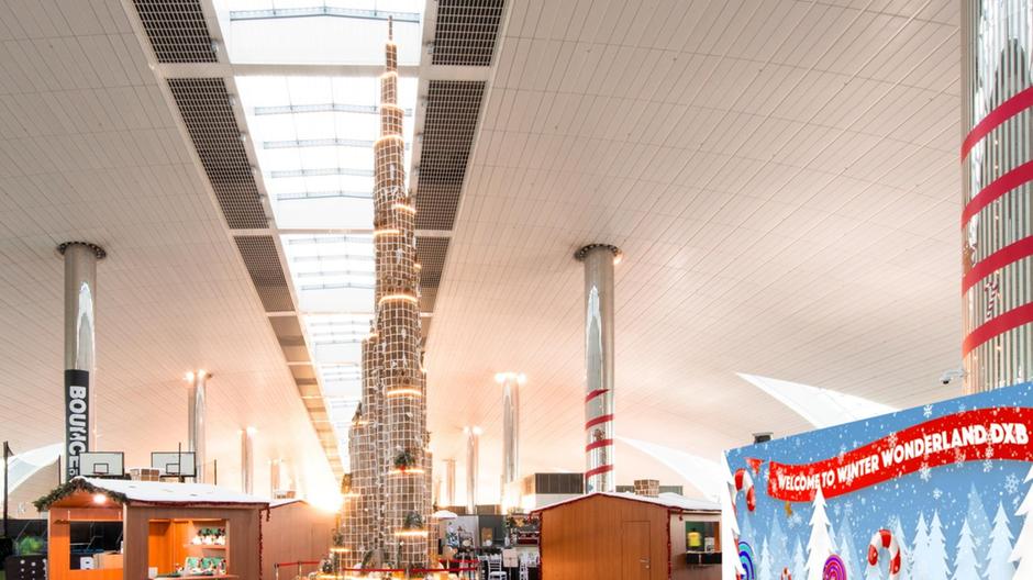 A supersized gingerbread house made in the vision of the Burj Khalifa greets visitors in Dubai International Airport’s terminal 3.