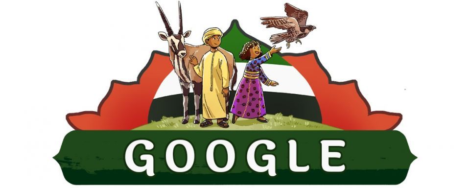 “Today’s Doodle celebrates this historic day with a depiction of two young children in national dress, interacting with an oryx and a falcon — the national animals of the UAE.