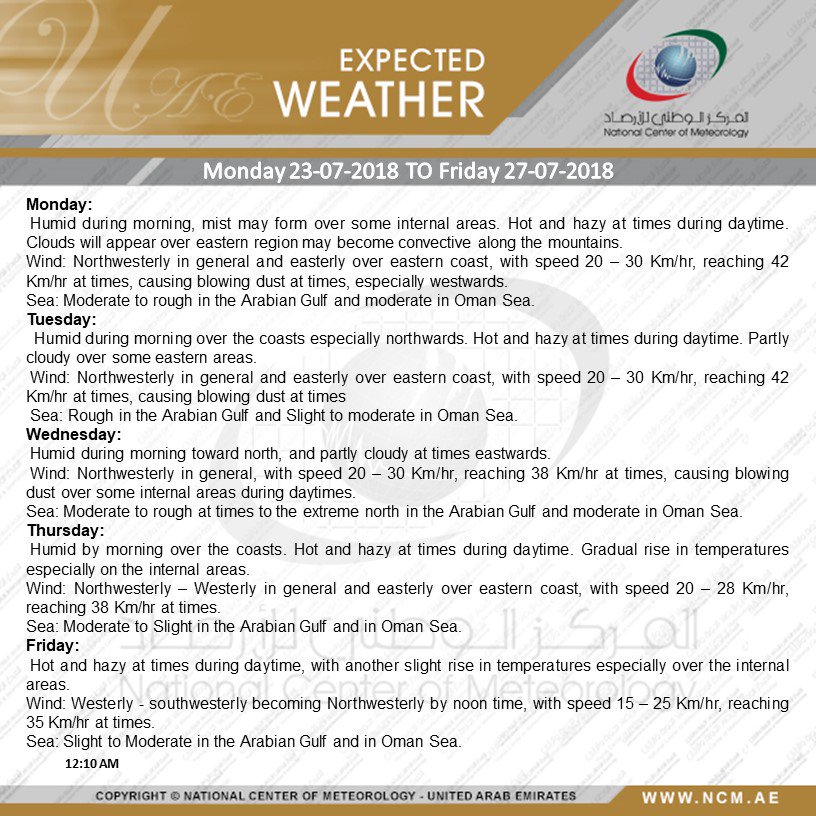 The sea will be moderate, becoming rough at times in the Arabian Gulf and slight to moderate in the Oman sea. More