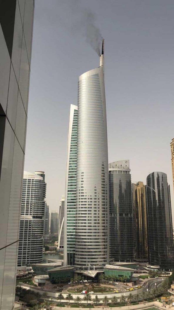 Dubai Civil Defence were called to deal with the fire that broke out on the spire at the top of Almas Tower, located in Jumeirah Lake Towers, earlier this afternoon.