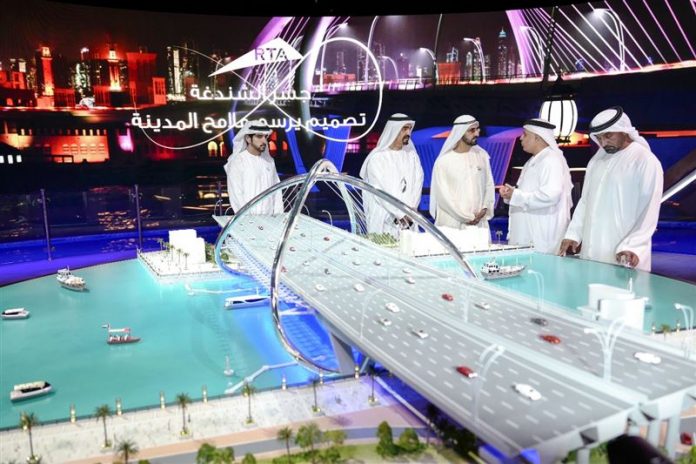 HH Sheikh Mohammed drew the infinity sign of the bridge on an electronic screen, following which a mammoth design of the Bridge was unveiled, heralding the start of construction works for the Al Shindagha Bridge.