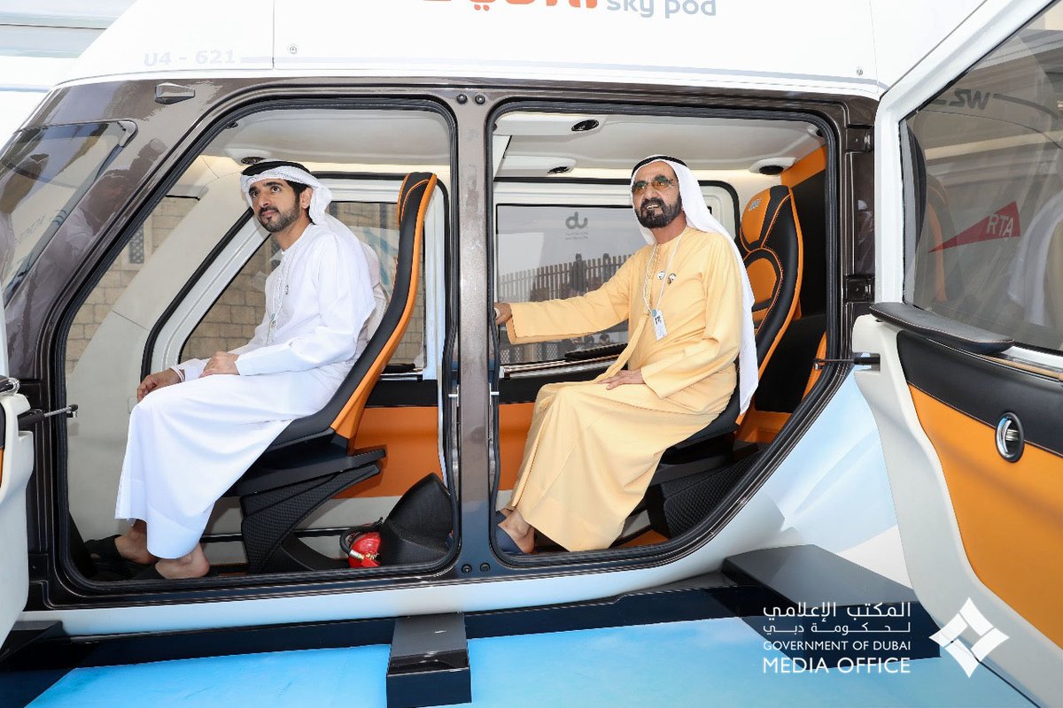 His Highness inspected the Sky Pods on the sidelines of the World Government Summit in the presence of HH Sheikh Hamdan bin Mohammed bin Rashid Al Maktoum, Dubai Crown Prince, Chairman of The Executive Council of Dubai and Chairman of the Board of Trustees of the Dubai Future Foundation.