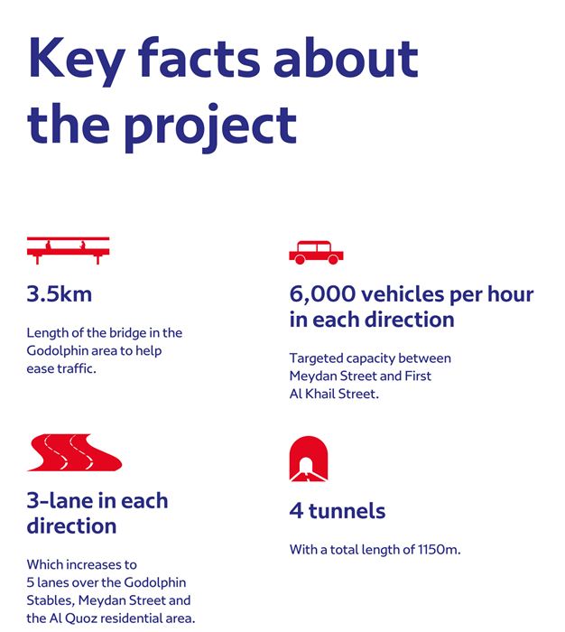 It also included the construction of a 420-metre bridge at the intersection of Al Meydan and First Al Khail Roads, a 420-metre tunnel for left-side turns from Al Saada Road to Meydan Road, and a 340-metre underpass for horse crossing at the Godolphin Stables. These works are expected to be completed by the mid of 2018.