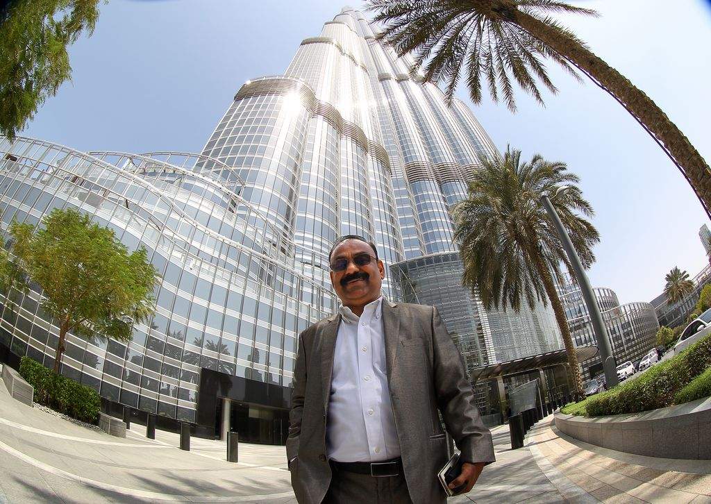 George V Neryamparampil, the owner of 22 apartments, on different floors of Burj Khalifa poses for a photograph in front of Burj Khalifa. (Photo by Juidin Bernarrd)